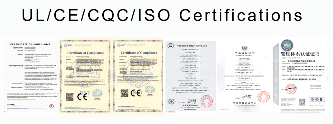 The company has passed ISO9001:2008 quality management system certification, CQC, 3C and other certification and CE, UL and other international safety certification;